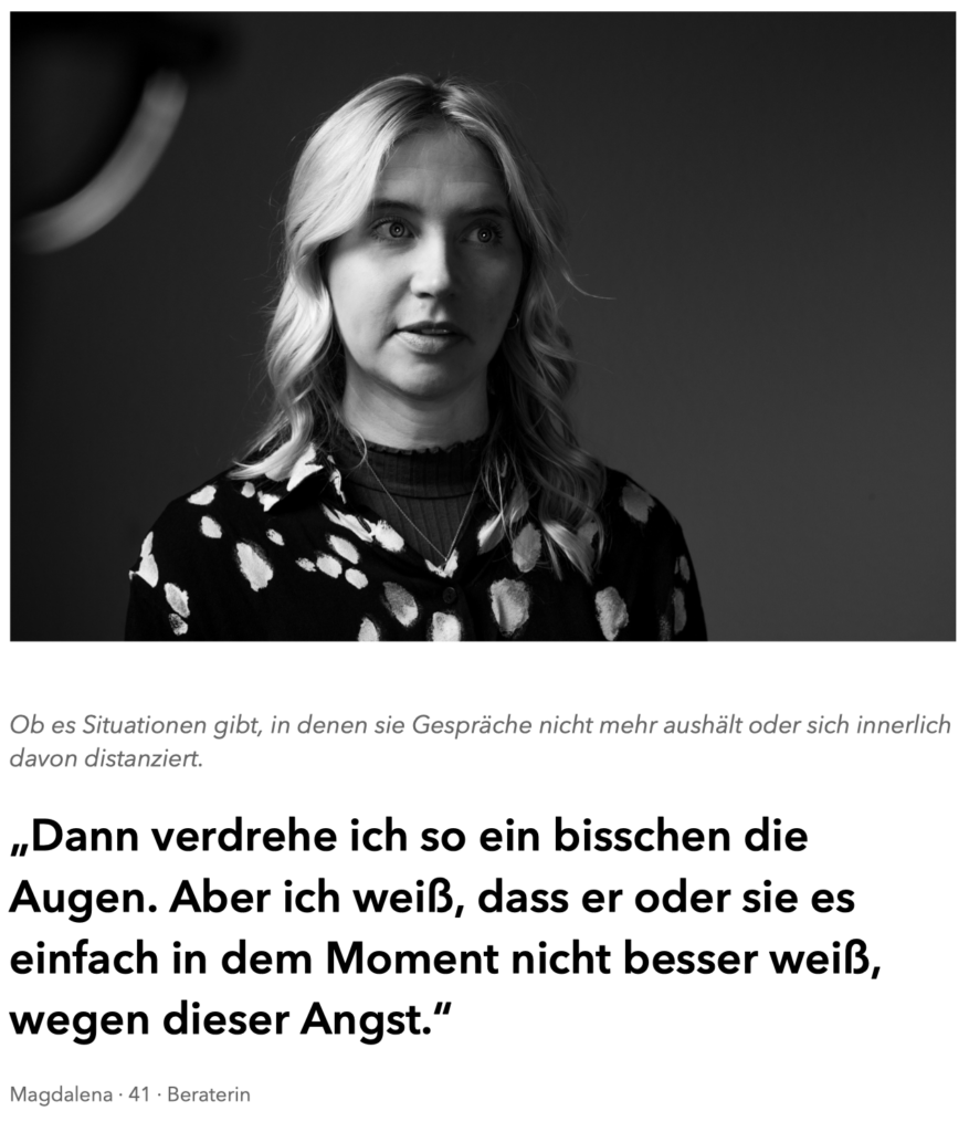 Magdalena: „Das Gespräch mit Mark Schenk hatte mir so gut gefallen, weil ich einfach ich selbst sein konnte und ohne Vorwürfe oder Bewertungen meine Meinung erzählt habe. Es war für mich persönlich eine wichtige Erfahrung und kann es wirklich jedem nur weiterempfehlen!“
